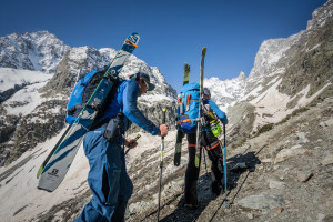 The approach to the Glacier Blanc is firstly an hours walk up to the snow line , to walk in ski boots or trainers and then stash the trainers was the first question to grapple with . Ed and I both chose to walk in trainers , Clement walked in ski boots cos he’s hardcore , in fact most people walked in ski boots so I guess Ed and I were just softies.